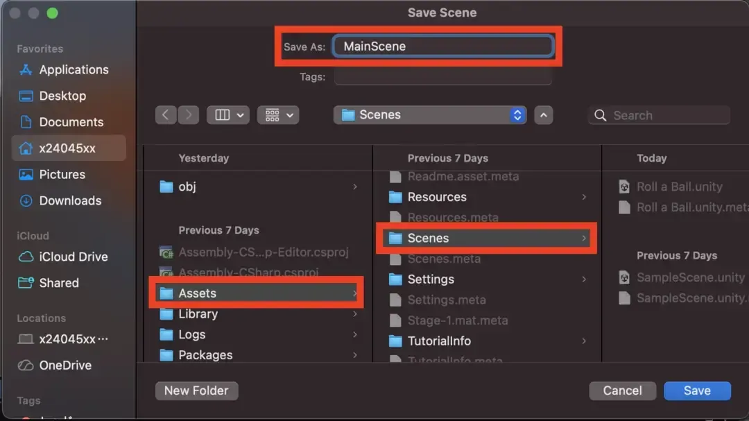 - ファイル名: 「MainScene」など、好きな名前をつけて「保存」を押してください。