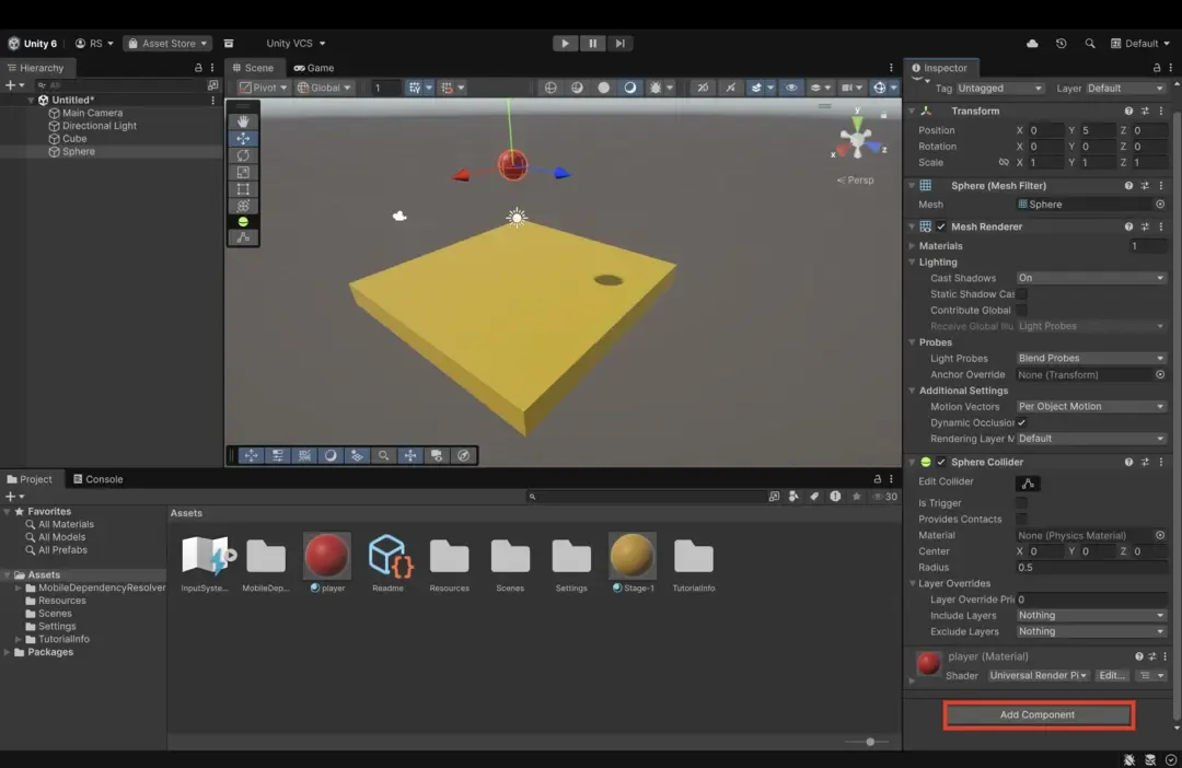 Section titled “2. 球に重力をつけてみよう”オブジェクトに物理法則を適用する「Rigidbody(リジッドボディ)」を追加します。